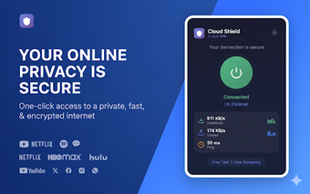 عملية التثبيت بسيطة وسهلة الاستخدام. بعد تثبيت الملحق، يمكن للمستخدمين الاتصال بنقرة واحدة للاستمتاع بتجربة تصفح آمنة. يستخدم Cloud Shield تشفيرًا آمنًا لحماية البيانات من التهديدات المحتملة مثل القراصنة ومراقبة مزودي خدمة الإنترنت. وهذا يجعله خيارًا مثاليًا لأولئك الذين يستخدمون شبكة Wi-Fi العامة بشكل متكرر أو يرغبون في الحفاظ على هويتهم على الإنترنت أثناء الوصول إلى مواقعهم المفضلة.